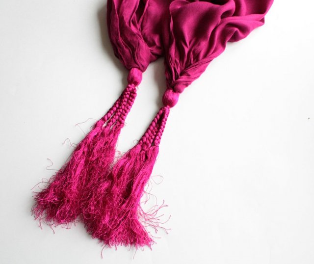 Buraczkowy szal wykończony efektownymi detalami, wykonany z wiskozy.