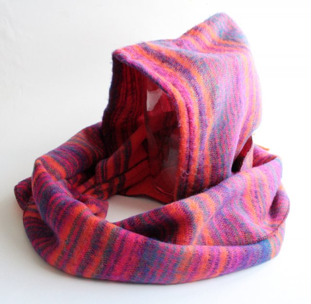 Wyjątkowy szal połączony z kapturem. Materiał jest miękki, miły w dotyku, idealnie sprawdzi się w chłodne dni. Jest to prawdopodobnie akryl. Kolory: pomarańczowy, fiolet,osty róż, chaber-granat.