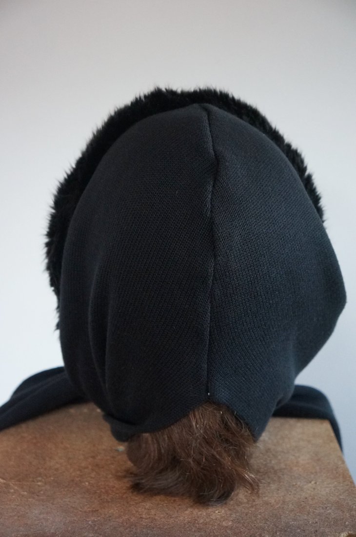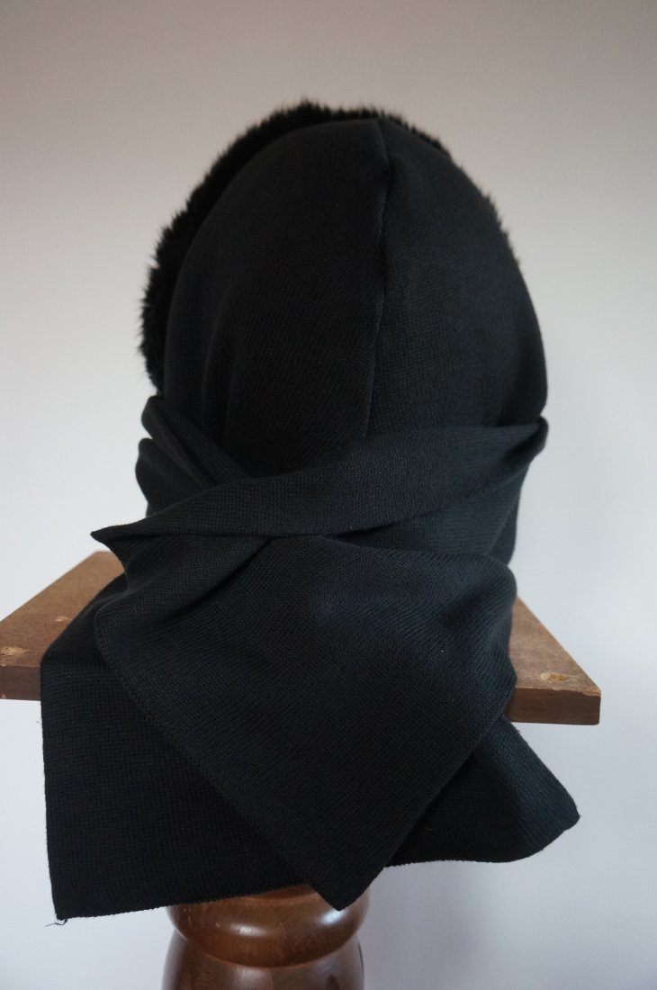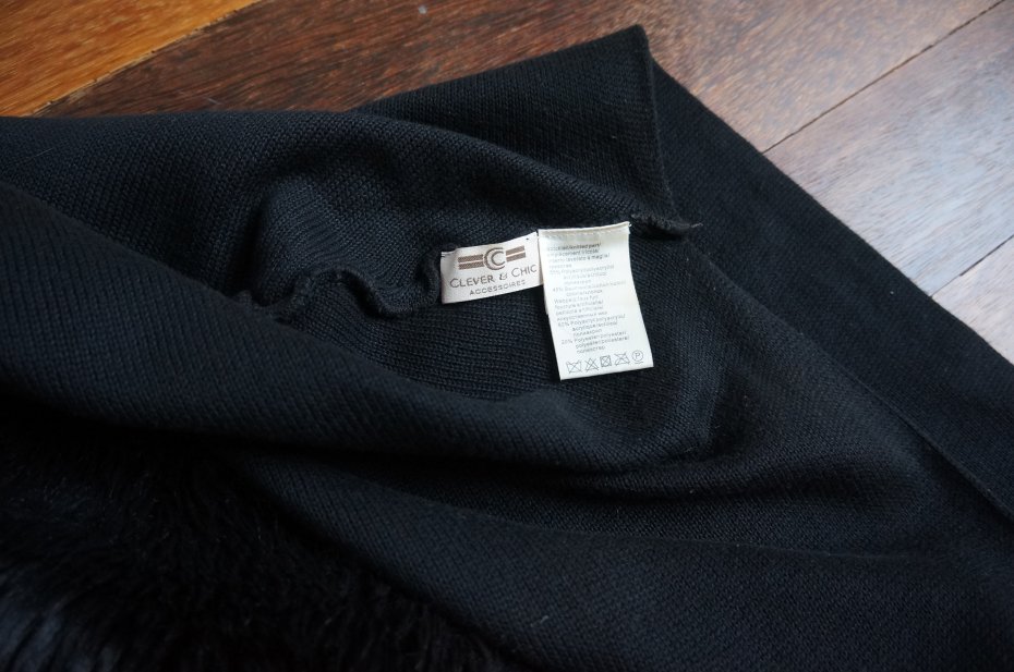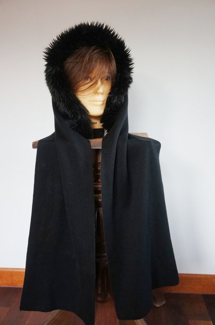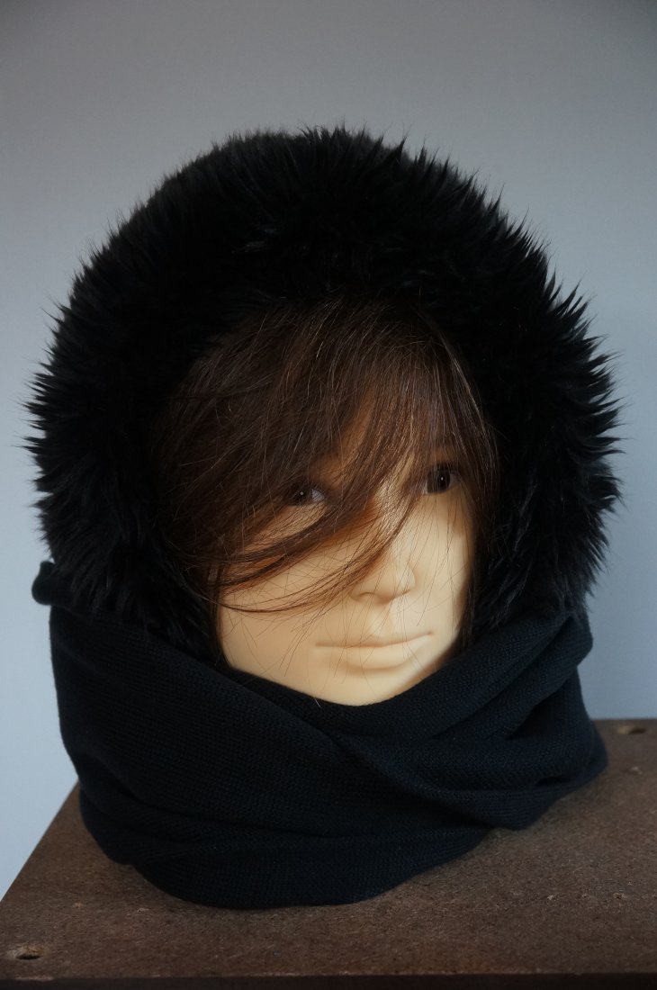 Szal z kapturem obszytym sztucznym futerkiem. Marka Clever & Chic. Kolor czarny. Szal na jednym końcu ma kieszonkę zapinaną na suwak. Ciepły, miły w dotyku. Idealny na chłodne dni. Stan bardzo dobry.