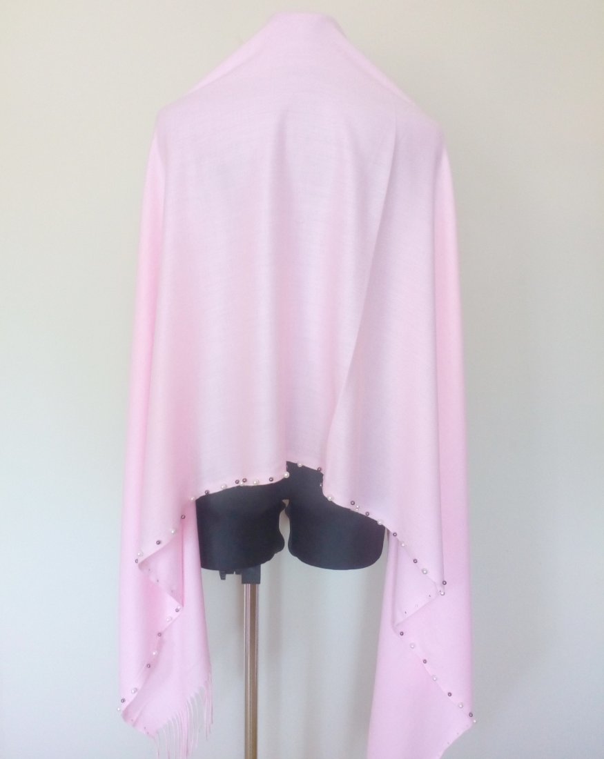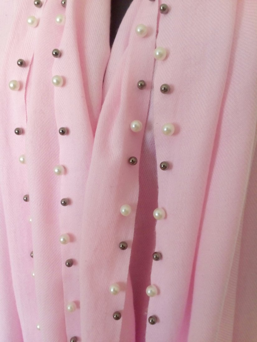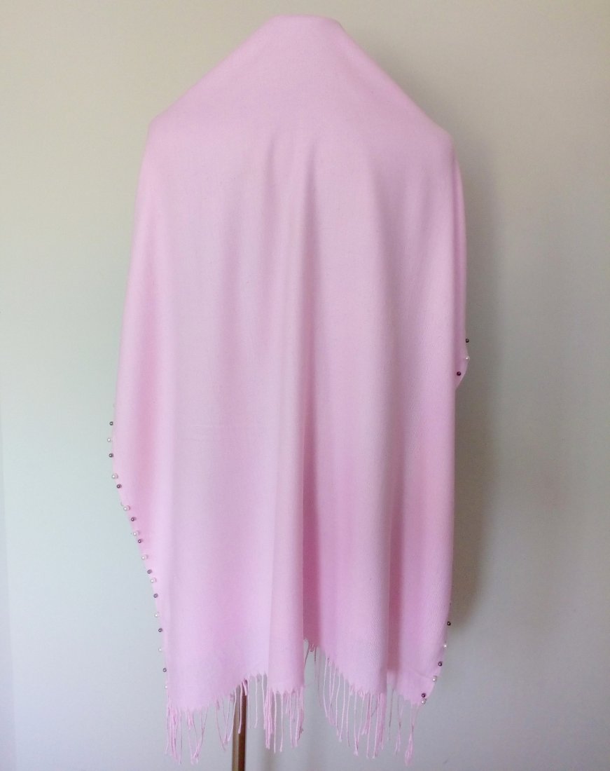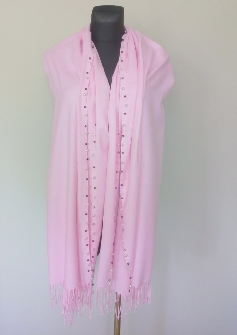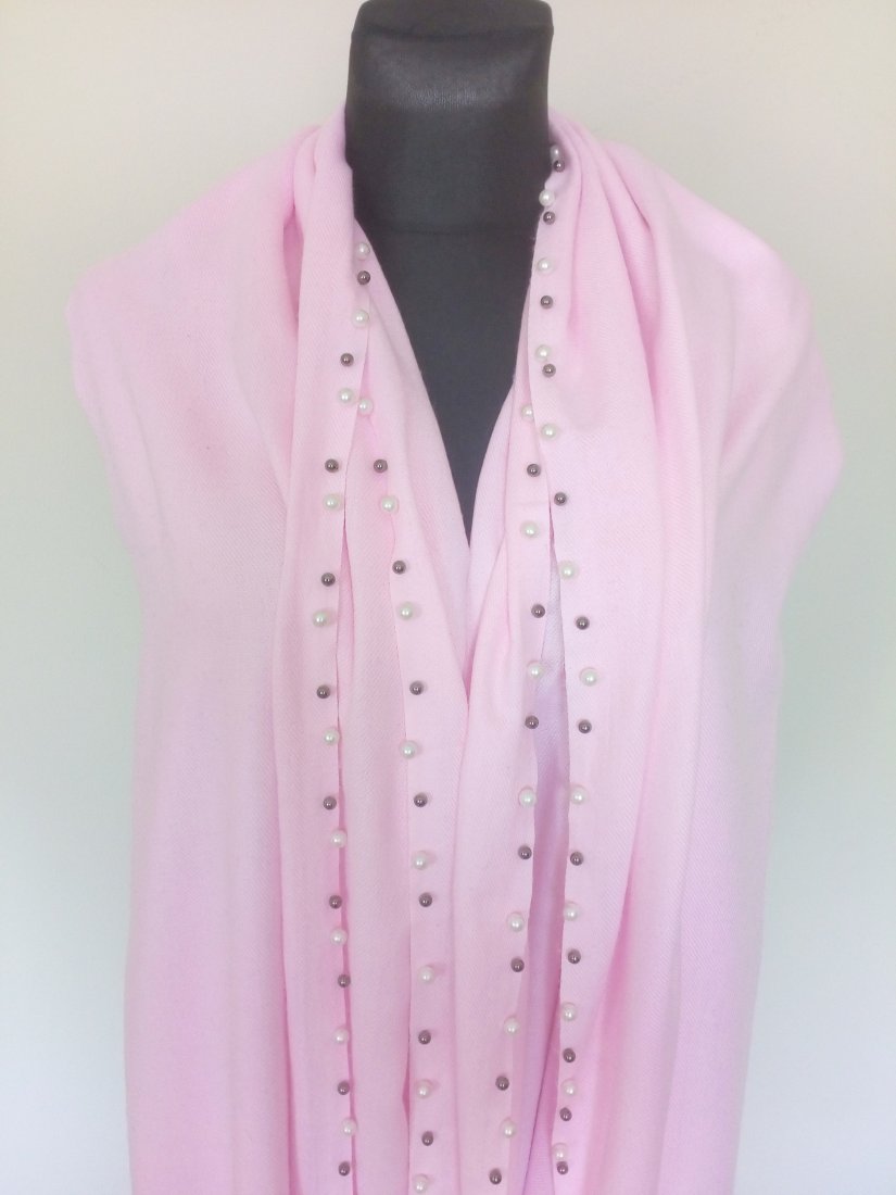 Jasnoróżowy szal z frędzlami, po brzegach zdobiony koralikami w perłowym i grafitowym kolorze
