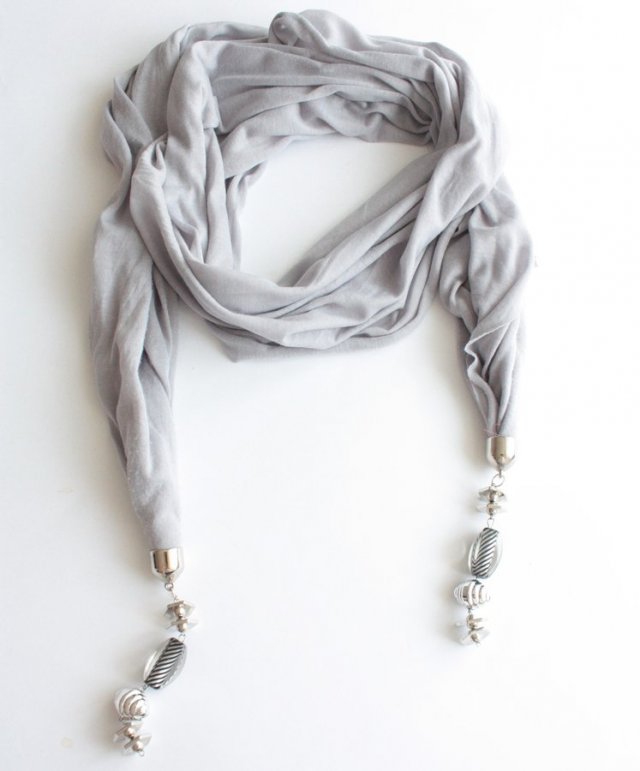 Duży szary szal z biżuteryjnym wykończeniem brzegów. Materiał to prawdopodobnie wiskoza.