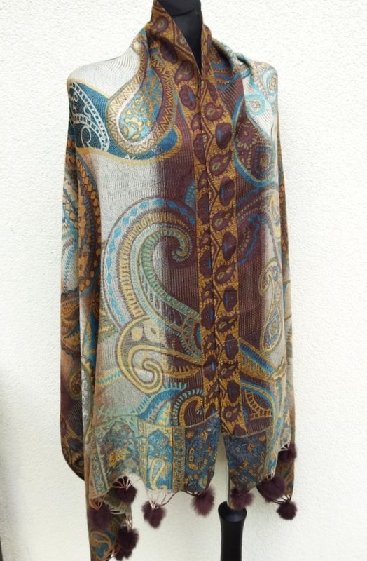 Miły wiskozowo-wełniany żakardowy szal z wzorami paisley w kolorystyce odcieni beżu i brązów , szmaragdowej i turkusowej zieleni, z pomponami z króliczego futerka