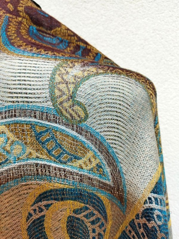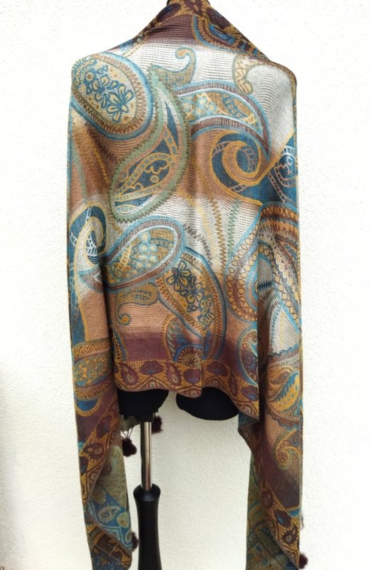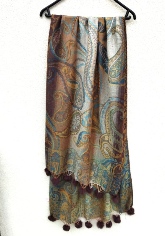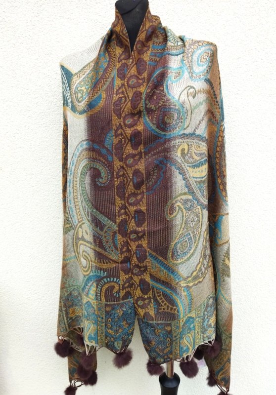 Miły wiskozowo-wełniany żakardowy szal z wzorami paisley w kolorystyce odcieni beżu i brązów , szmaragdowej i turkusowej zieleni, z pomponami z króliczego futerka