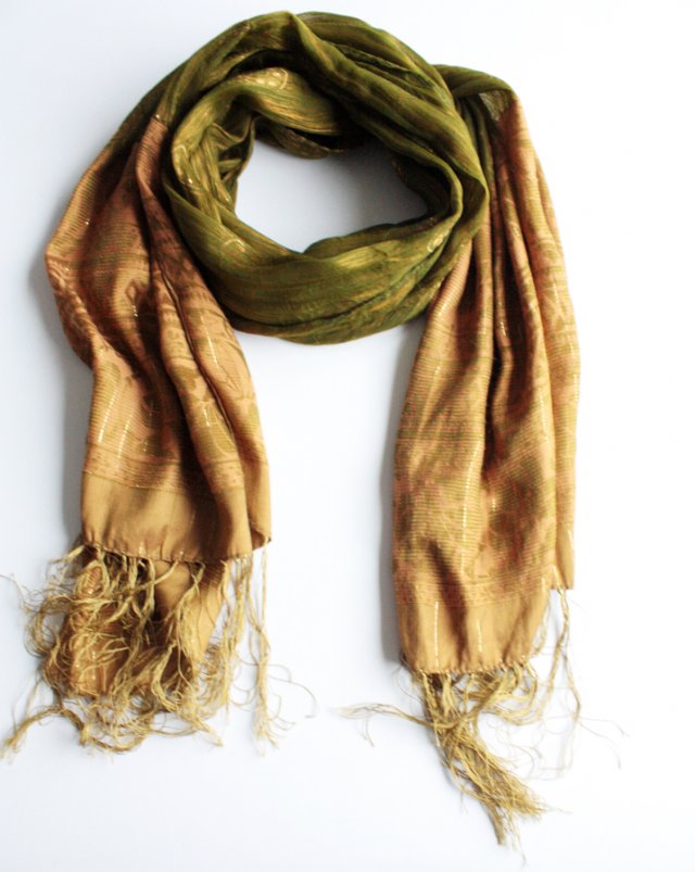Przepiękny szal w odcieniach zgaszonej zieleni i ciemnego beżu, przetykany subtelną, złotą nitką.