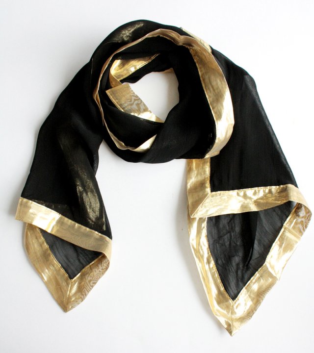 Duży, niebanalny szal w kolorze czarnym, ozdobiony złotym materiałem na brzegach.
