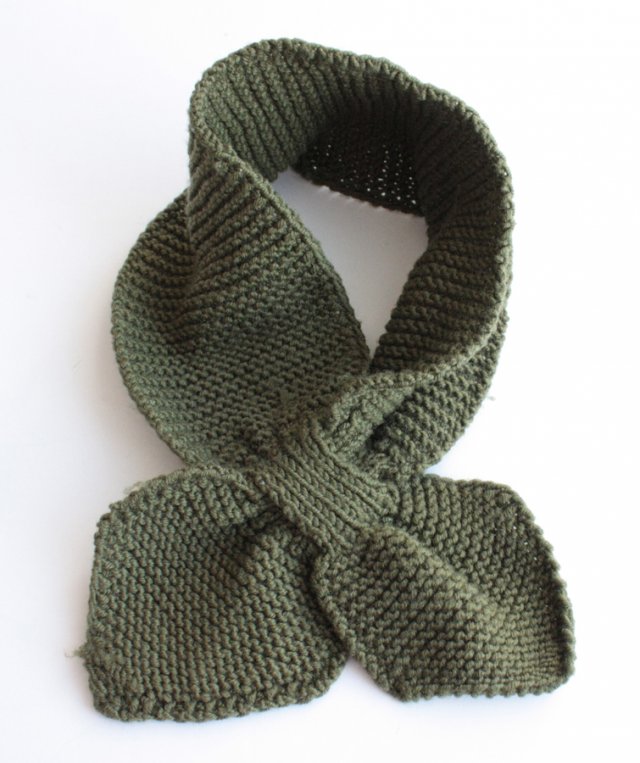 Oryginalny kołnierz/szal/opaska na głowę z dzianiny w ciemnym, stonowanym odcieniu zieleni. Produkt posiada tunel, który umożliwia połączenie dwóch brzegów.