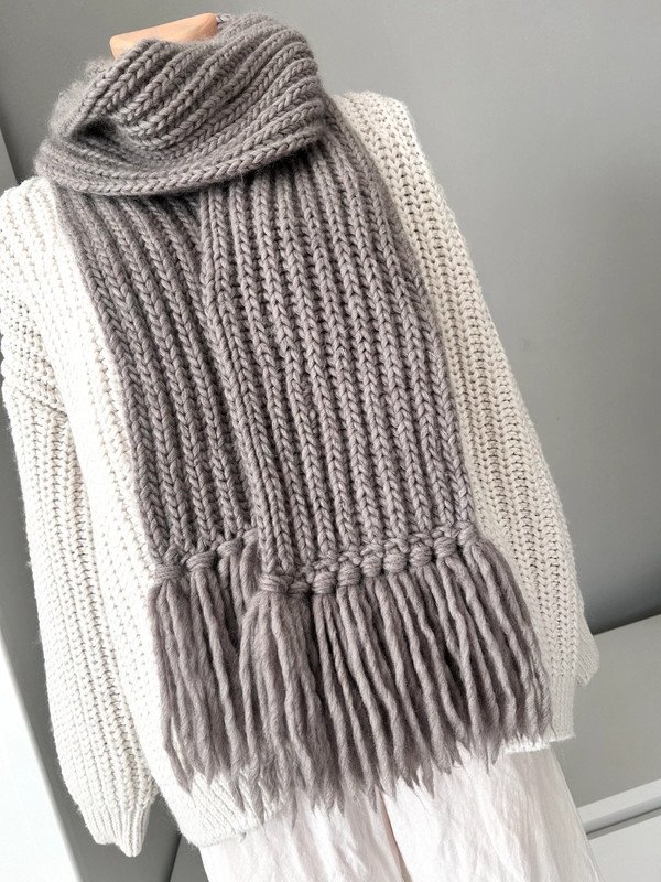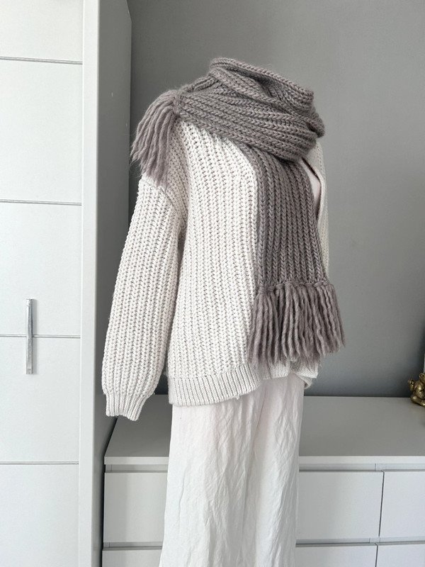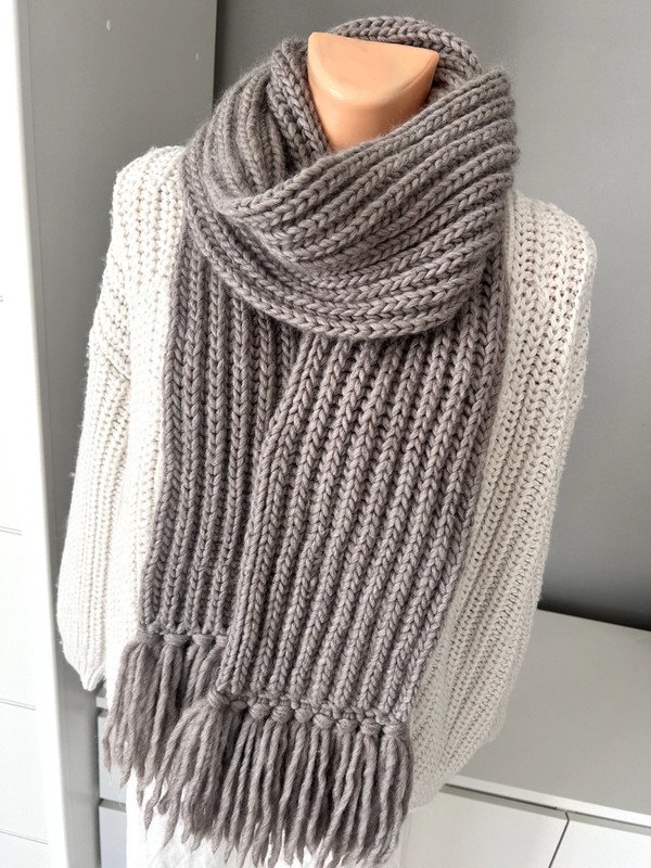 Szalik, szal kolor szaro beżowy. Klasyczny wzór z frędzlami, gruby splot.
