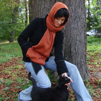 Szalokaptur z mufką na ręce Można go również nosić jako szal ze zwisającym na plecach kapturem.