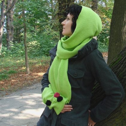 Szalokaptur z mufką na ręce Można go również nosić jako szal ze zwisającym na plecach kapturem.