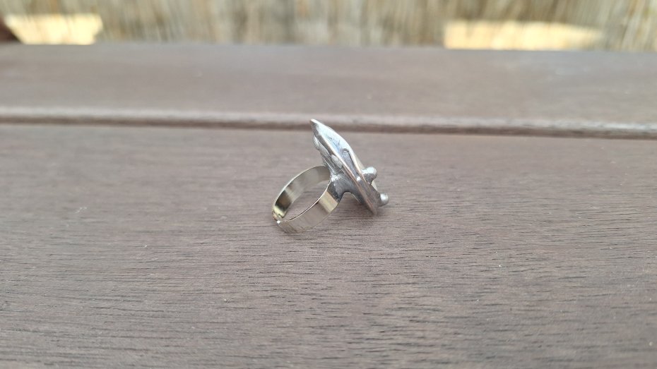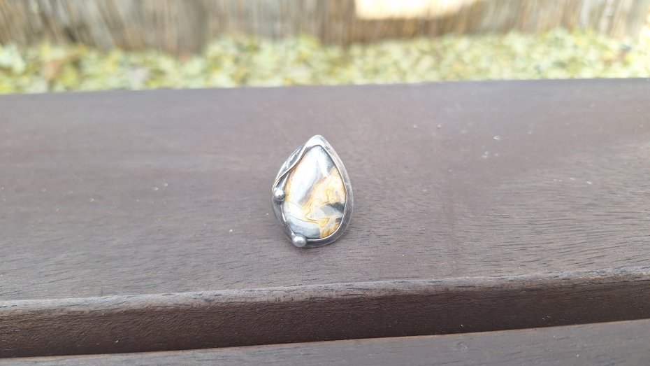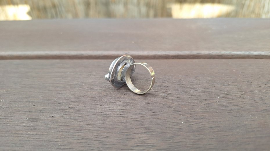 Pierścionek wykonany z miedzi, cyny i agatu. Wymiary ok. 2.7 na 2 cm. Regulowany. Nie jest ciężki.