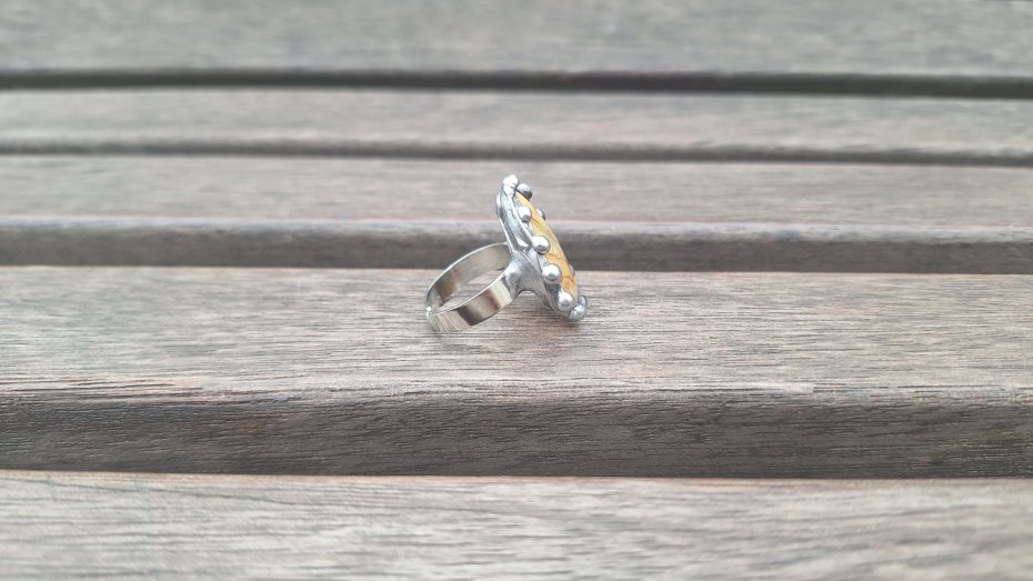 Pierścionek wykonany z miedzi, cyny i agatu. Wymiary ok. 2.5 na 1.7 cm. Regulowany. Nie jest ciężki.