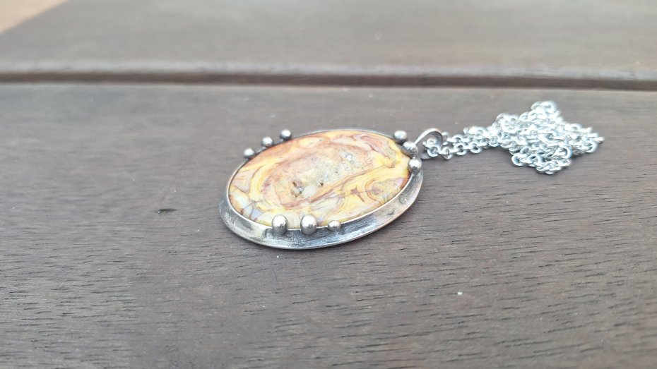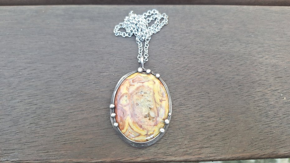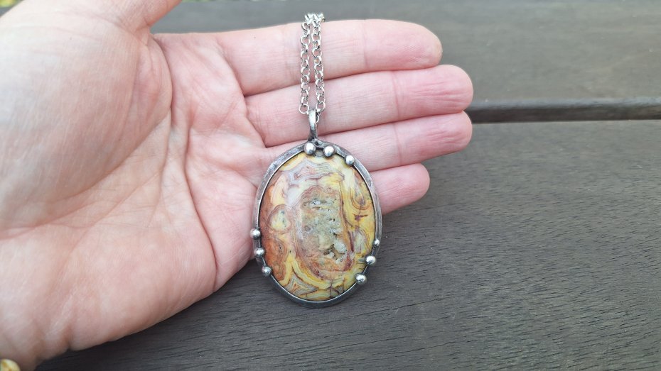 Wisiorek wykonany z miedzi, cyny i agatu crazy lace. Wymiary ok. 5 na 3.7 cm. Zawieszony na łańcuszku o długości ok. 50 cm.