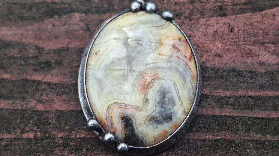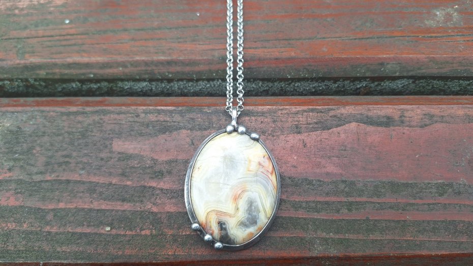 Wisiorek wykonany z miedzi, cyny i agatu crazy lace. Wymiary ok. 5 na 4 cm. Zawieszony na łańcuszku o długości ok. 50 cm.