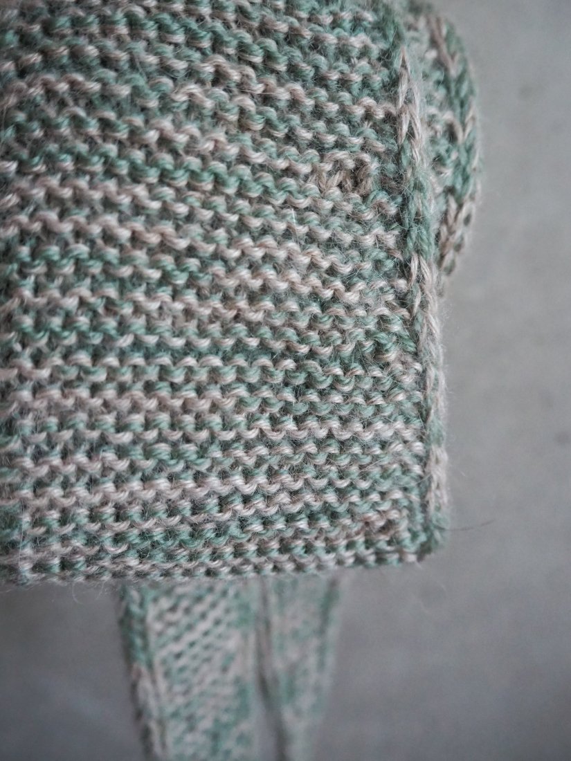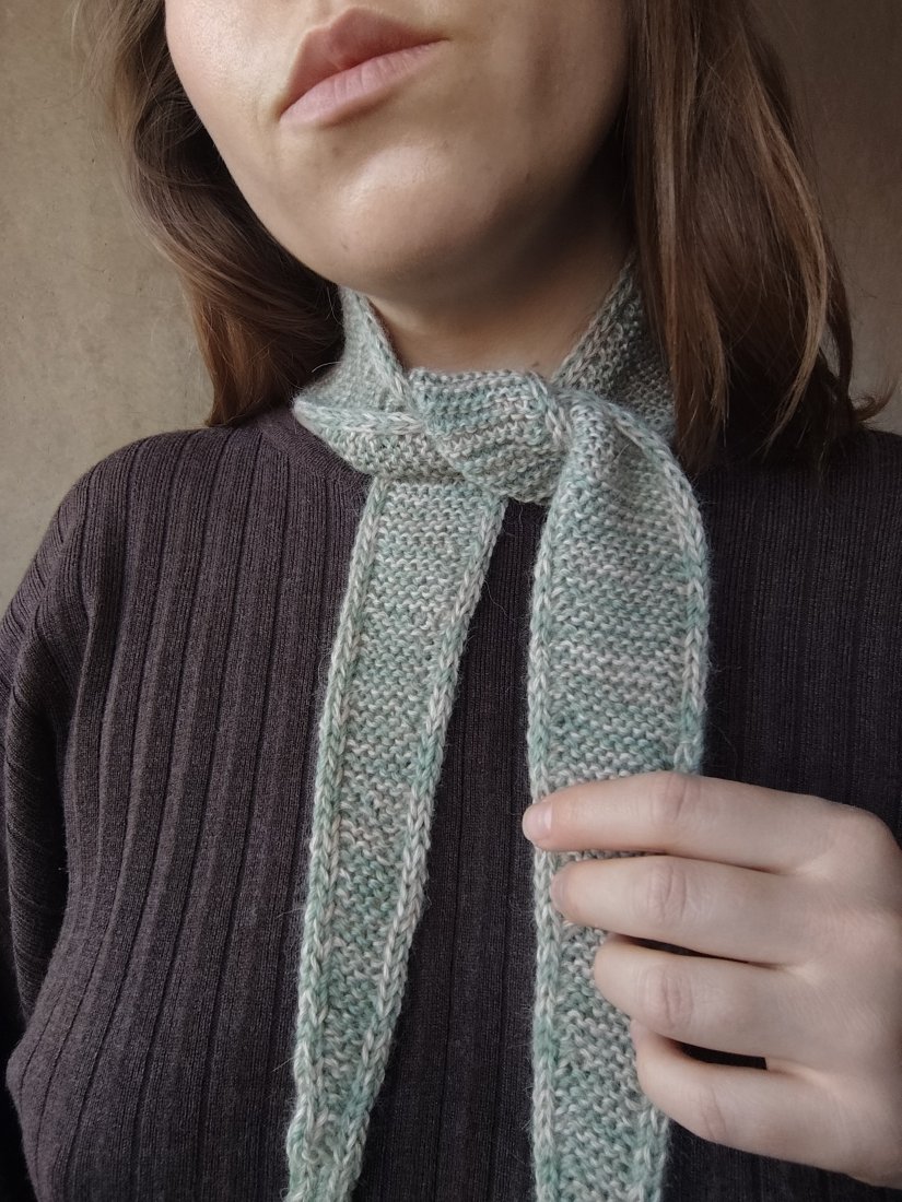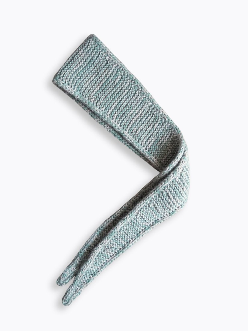 Szalik w piękny beżowo-szałwiowy melanż. Wykonany ręcznie na drutach z miękkiej alpaki. Nie drapie w dotyku.