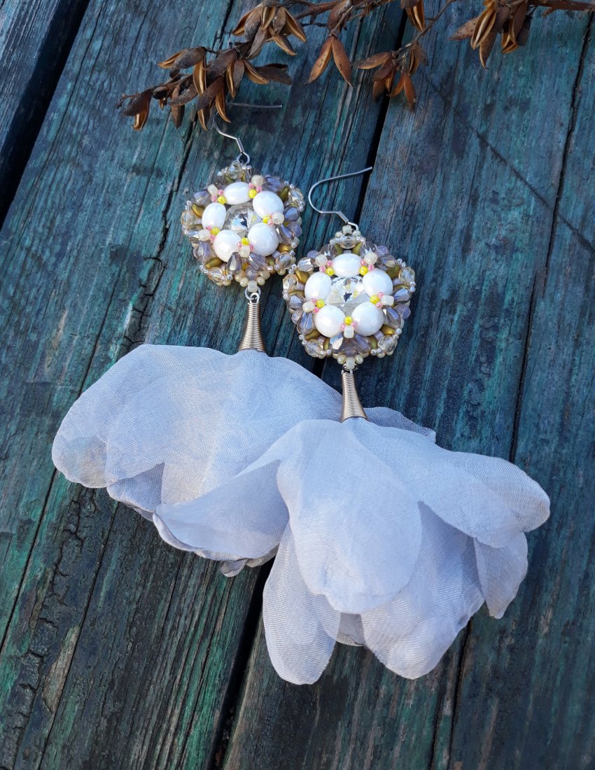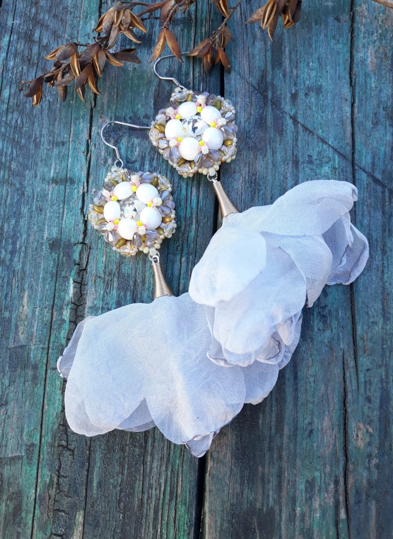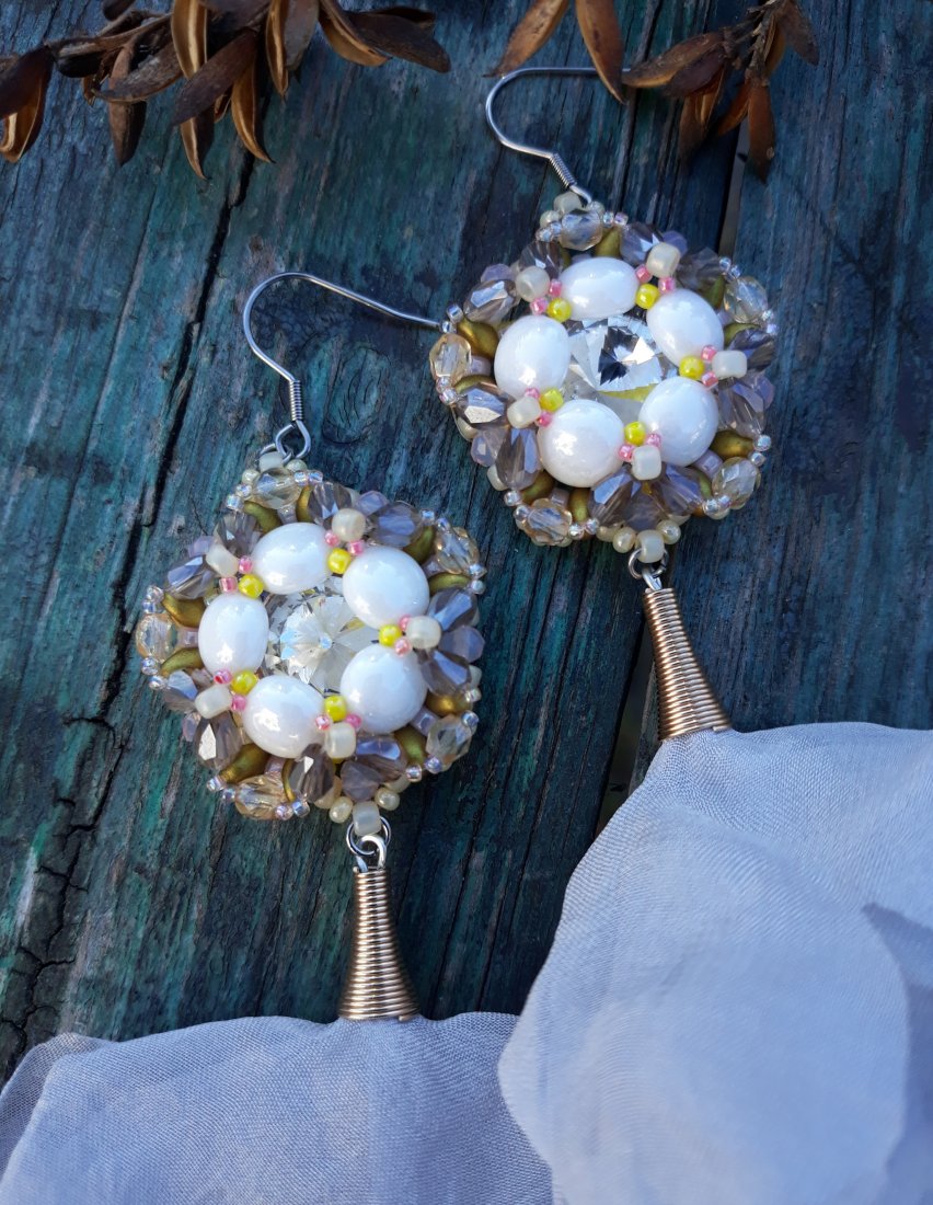 ,,szara baletnica,, to urokliwe kolczyki wykonane z kryształowej rivoli oplecionej szklanymi koralikami i kryształkami w różnych odcieniach szarość, bieli i żółtego. Całości kolczyka dopełnia chwost kwiatek w jasnoszarym kolorze.