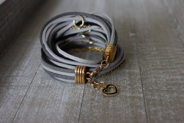 Bransoletka wykonana z ekozamszu, łańcuszka oraz elementów w kolorze złotym. Bransoleta do dwukrotnego zawinięcia wokół nadgarstka. Całkowita długość bransolety 37,5 - 39 cm. Kolory rzemieni: jasny i ciemny szary, czarny.