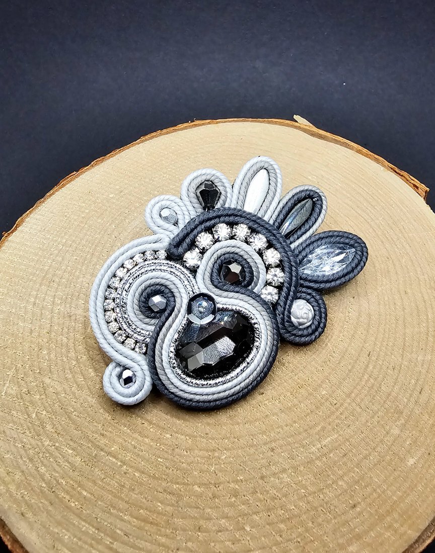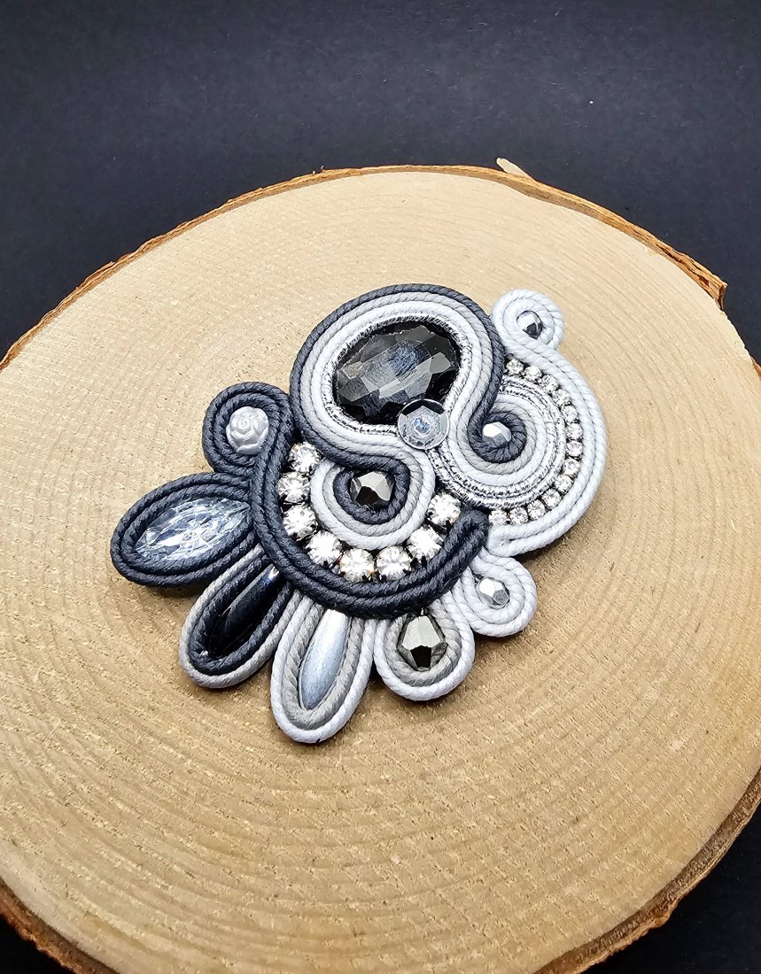 Broszka w 3 odcieniach szarości. Wykonana z szklanych fasetowanych kryształków, koralików o różnych kształtach i wielkościach, taśmy z cyrkoniami oraz niewielkich szklanych koralików. Błyszcząca broszka w stonowanej i uniwersalnej kolorystyce.