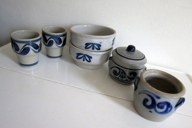 Naczynia wykonane ze szkliwionej i dekorowanej kobaltem ceramiki . Zestaw składa się z naczyń z różnych zestawów [ to nie jest oryginalny komplet ]. Ceramika różni się odcieniem gliny, malaturą i szkliwieniem.