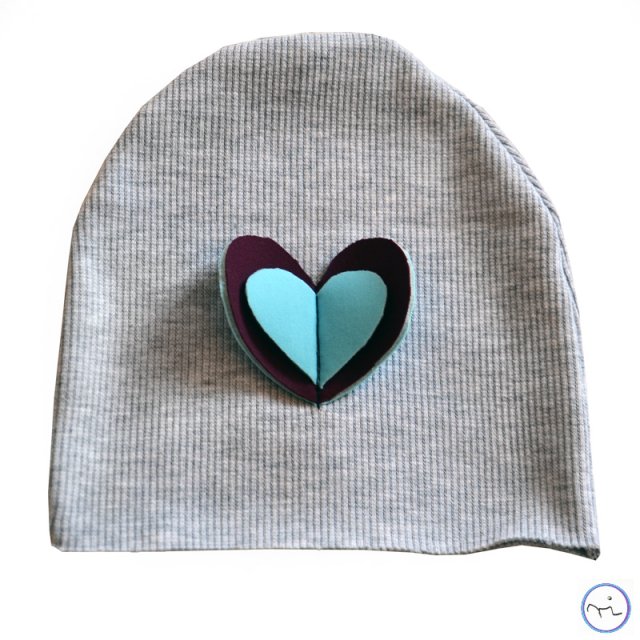 Śliczna czapeczka z szarej elastycznej dzianiny oraz fioletowo-błękitnej pianki. Obwód czapeczki 40 cm. Możliwość zamówienia dowolnego rozmiaru. Czas oczekiwania na wykonanie zamówienia do 7dni.