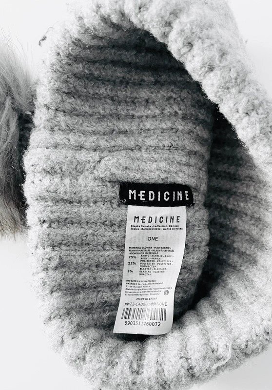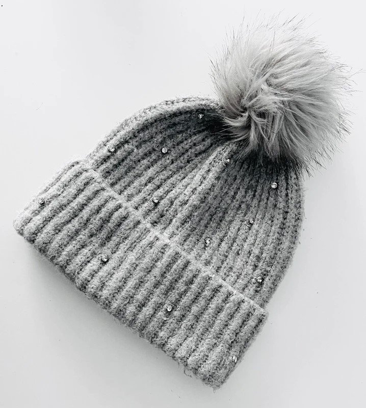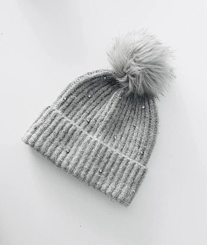 Zimowa czapka w szarym kolorze z pomponem i kryształkami