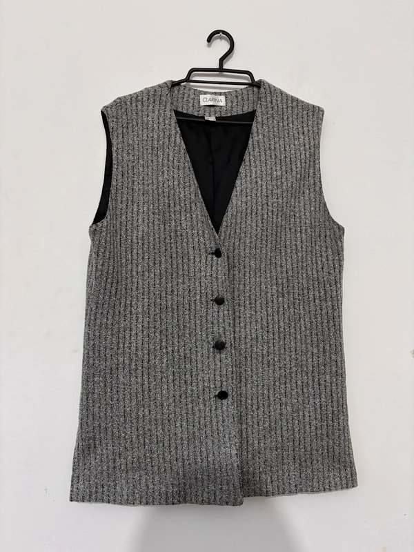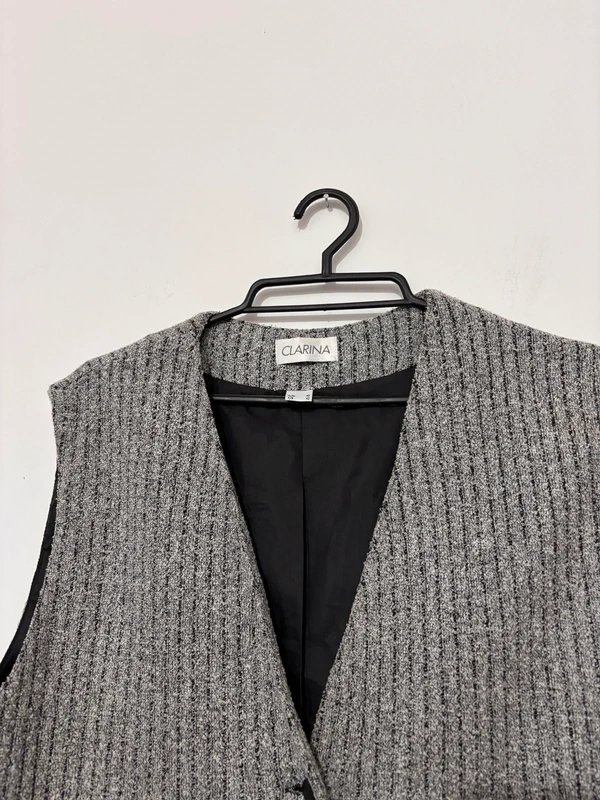 kamizelka, szara kamizelka, wełniana kamizelka, Clarina, prążki, elegancka kamizelka, zapinana na guziki, dekolt V, melanż szary, wełna, poliester, niemiecka marka, bezrękawnik, kamizelka damska, rozmiar 40, klasyczna kamizelka, office wear, smart casual, jesienna kamizelka, zimowa kamizelka, pod marynarkę, warstwowanie, podszewka, czarna podszewka, guziki ozdobne, bardzo dobry stan, second hand, Vinted, Clarina 40,