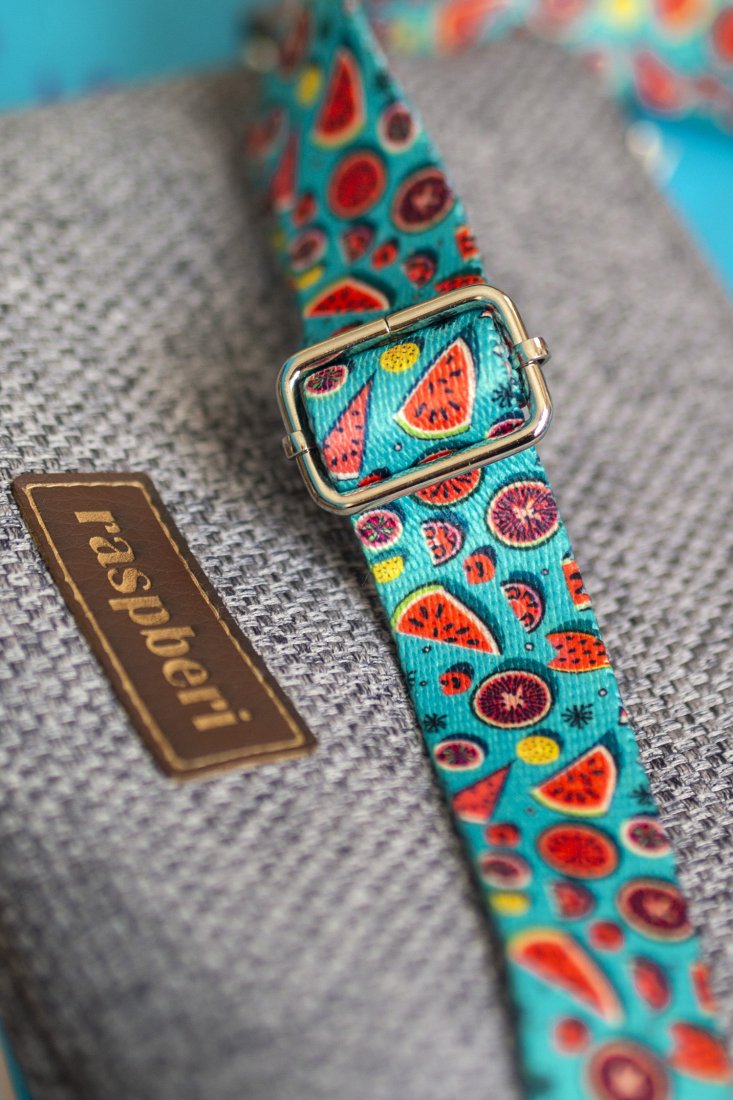 Torebka posiada regulowany kolorowy pasek i srebrne okucia.