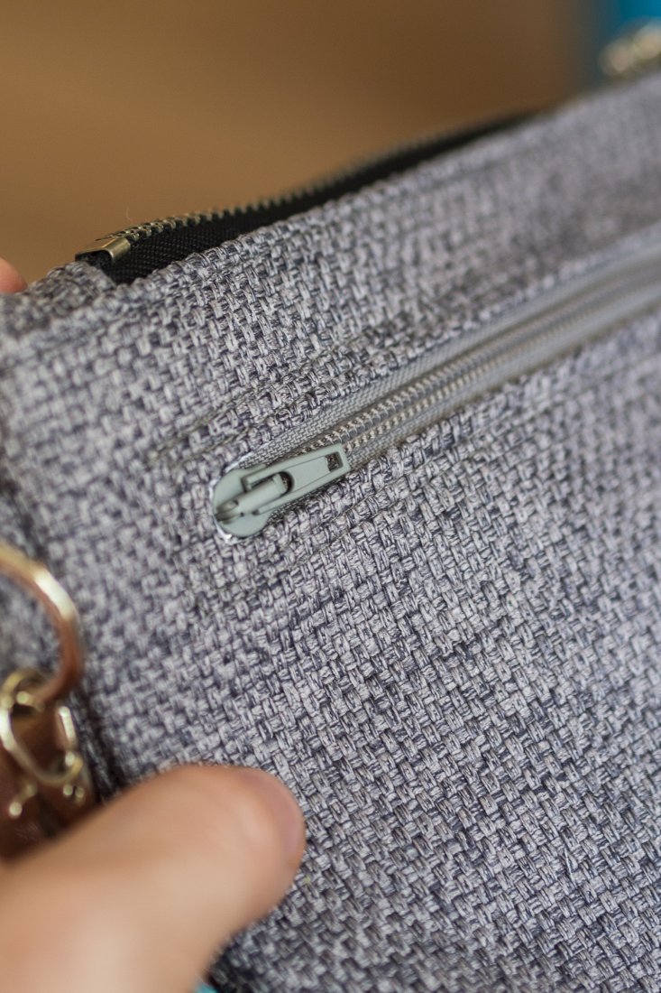 Małe zaszewki na dnie. Z tyłu oraz w środku torebki kieszonki zapinane na suwak. Środek wykończony bawełnianą podszewką.