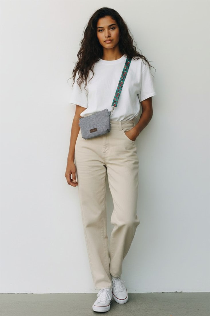 Prosta torebka, kopertówka w rozmiarze mini w z plecionej tkaniny kolorze szarym. Zapinana na suwak. Może również sprawować funkcję nerki.