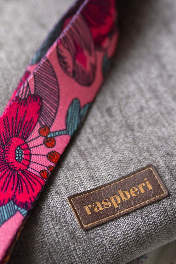 Torebka posiada regulowany, kolorowy pasek w kwiaty i srebrne okucia.