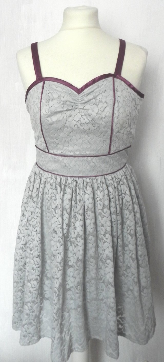 Sukienka, która wspaniale podkreśla sylwetkę - talię, biust uszyta z koronki w kolorze szarym na szarej podszewce, brzegi na górze wykończone fioletową lamówką/aksamitną