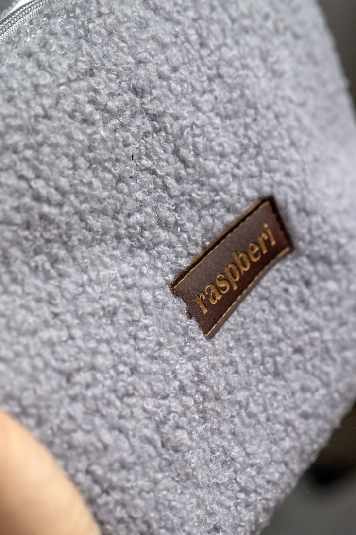 Duża kosmetyczka w kolorze szarym z tkaniny typu bukla.