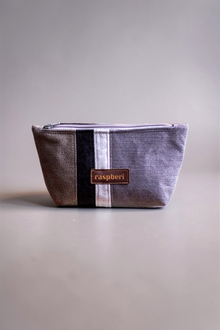 Średniej wielkości kosmetyczka wykonana kilku rodzajów tkanin. Stworzona w duchu no waste.