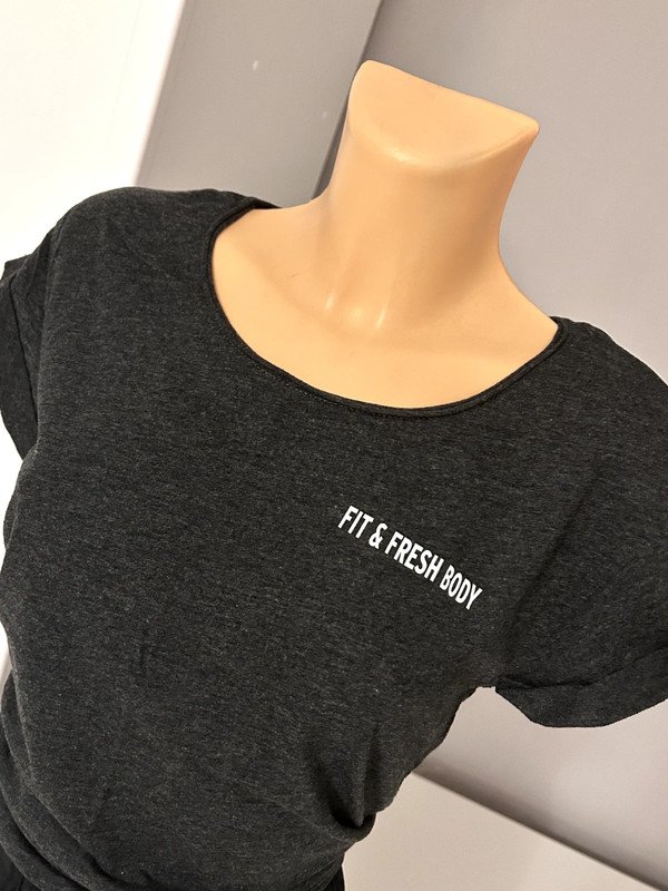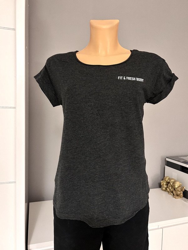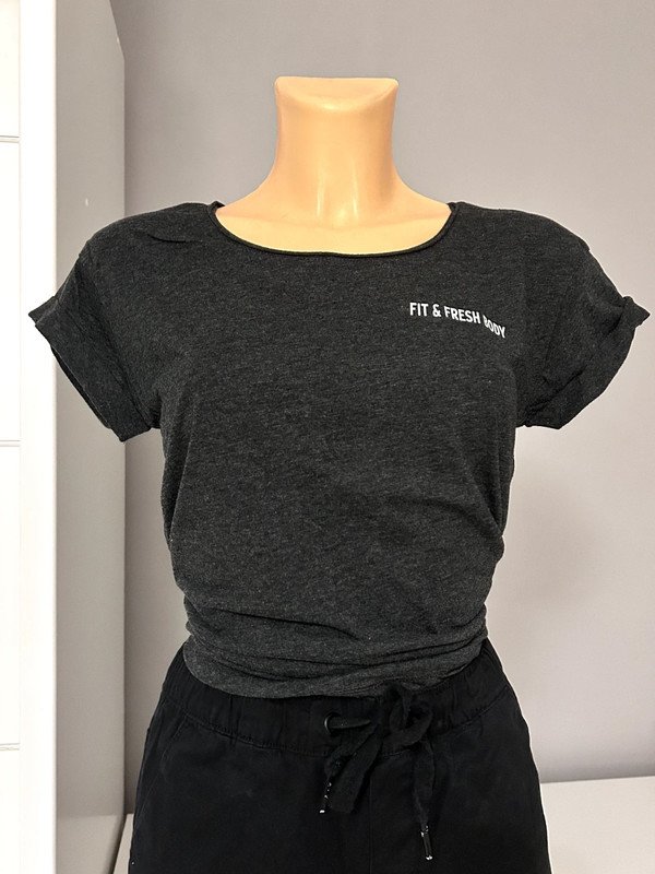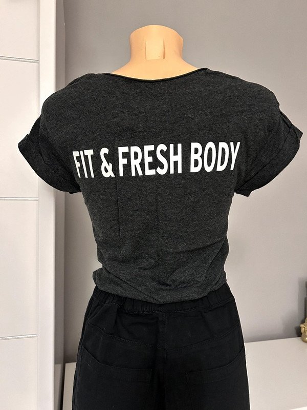 Szary t-shirt, rozmiar z metki to XS 34. Z przodu posiada mały napis fit & fresh body, z tyłu posiada duży napis fit & fresh body. Jest wykonany w 60% z bawełny, może służyć jako koszulka do ćwiczeń lub na siłowni.
