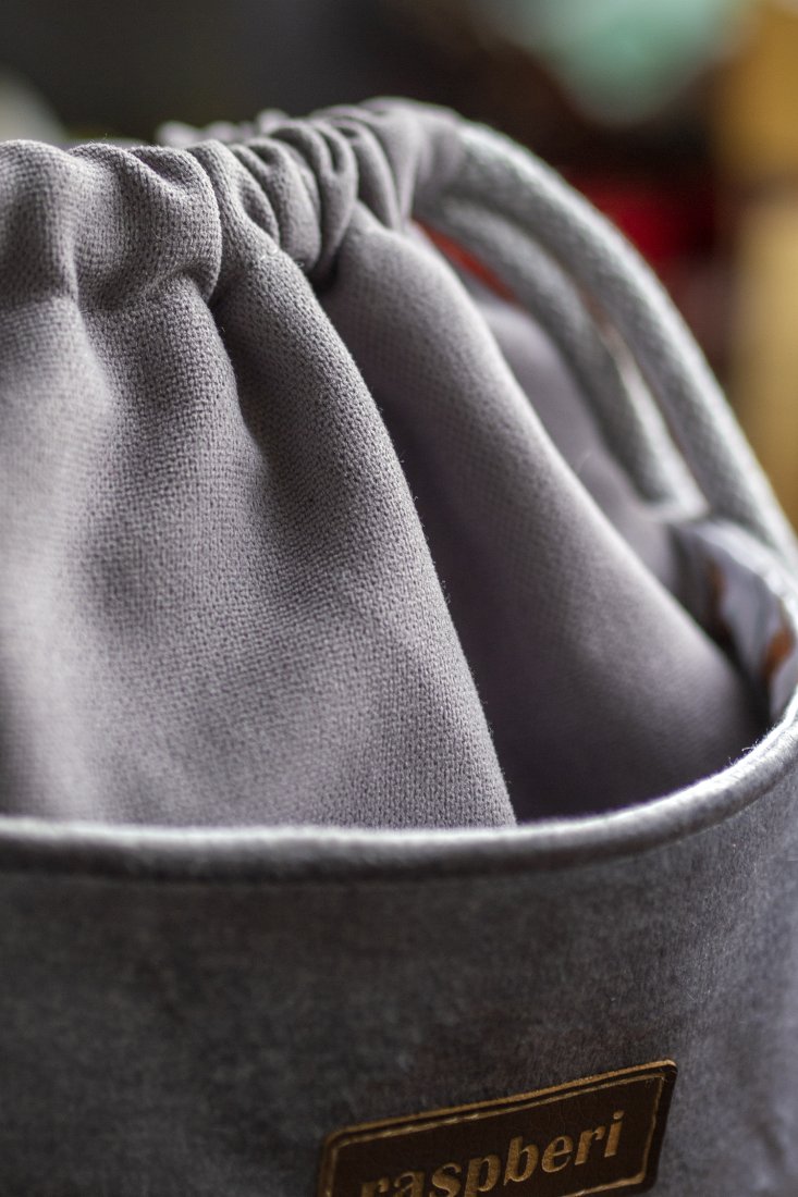 Wykonana z szarej tkaniny. Z przodu oraz z na tyle torebki kieszenie (np. na telefon czy chusteczki) z jasnoszarego weluru. W środku kieszonka zapinana na suwak.