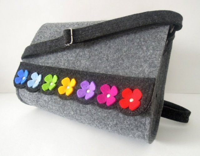 Torebka została wykonana z grubego, mocnego filcu, impregnowanego z lewej strony. Prosta forma, ciekawie zdobiona rządkiem kolorowych kwiatków. Bardzo wiosenna i urocza! Długość torebki - około 24 cm, wysokość około 22 cm. Została wykonana z dbałością o każdy szczegół - zapięcie na magnes, pod klapą kieszonka na suwak, w środku 2 inne kieszonki - na telefon i inne drobiazgi. Pasek został wzmocniony tasiemką satynową, posiada regulator długości.
