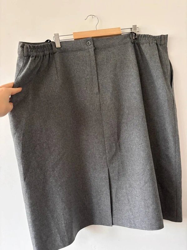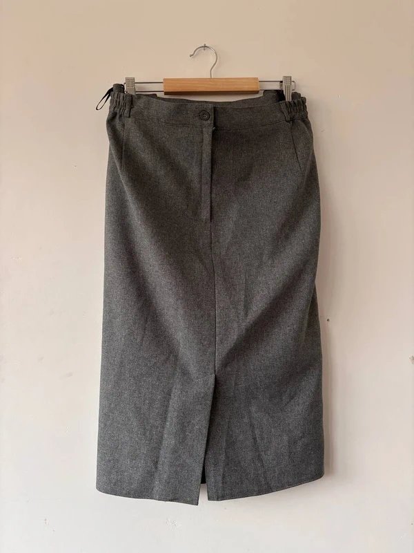 Klasyczna szara spódnica midi o prostym, eleganckim kroju. Model z rozcięciem z przodu, elastycznymi wstawkami po bokach w pasie oraz wygodnym zapięciem. Idealna do pracy, biura lub na co dzień — świetnie komponuje się zarówno z koszulą, jak i swetrem.