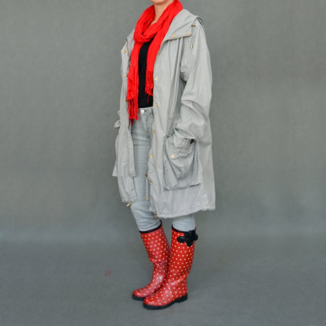 Cienka parka od CARLI F. W kolorze gołębiej szarości. Świetna na dżdżystą i wietrzną wczesną jesień. Nie ma podszewki. Tył ściągany, po bokach kieszonki. Zapinana na zamek i napy. Wszystkie ozdobniki w złotym kolorze.