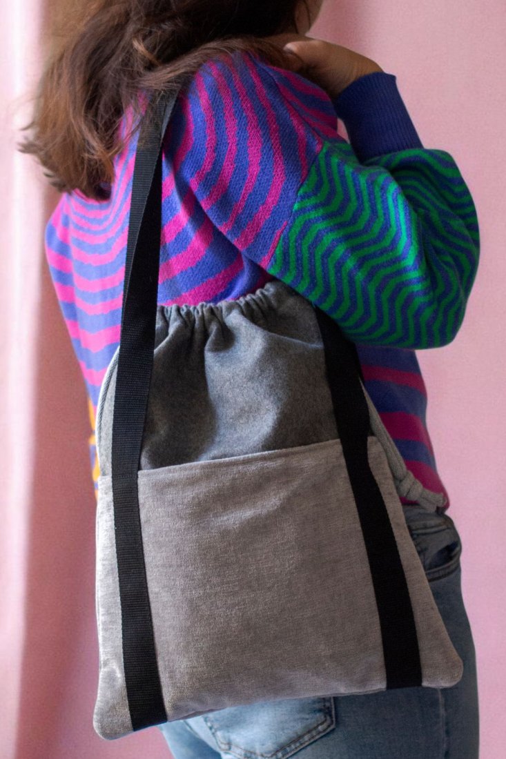 Torba na ramię z kominem, ściągana jak worek, w kolorze szarym. Z przodu i z tyłu torebki duże otwarte kieszenie.