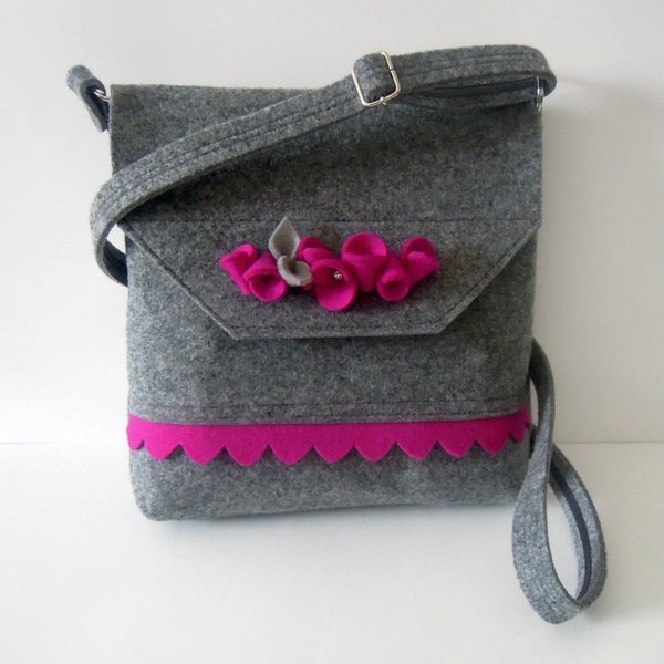 Torebka została wykonana z grubego, mocnego, impregnowanego filcu. Prosta forma, ciekawie zdobiona filcowymi kwiatkami i falbanką. Bardzo urocza! Długość torebki - około 23 cm, wysokość około 23 cm. Została wykonana z dbałością o każdy szczegół - zapięcie na magnes, w środku 2 kieszonki - na telefon i inne drobiazgi. Pasek o długości około 145 cm został dodatkowo wzmocniony tasiemką satynową, posiada regulację długości. Gorąco polecam!