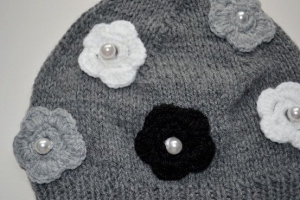 CZAPKA DLA ELEGANTKI Z MIŁEJ CIEMNOSZAREJ WŁÓCZKI OZDOBIONA KWIATKAMI I PEREŁKAMI.