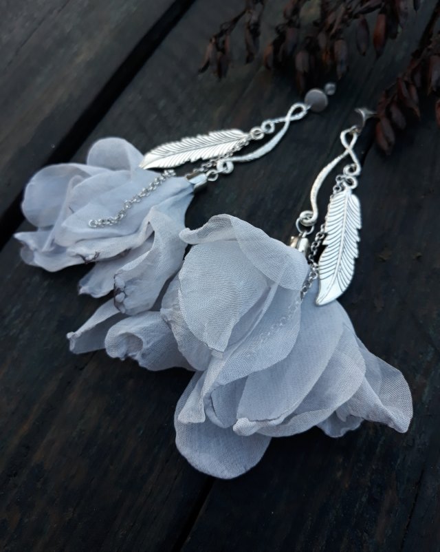 ,,szara z piórem,, to lekkie i zwiewne kolczyki utrzymane w kolorystyce szarości, wykonane z chwosta kwiatka i metalowych elementów w kolorze ciemnego srebra. Kolczyki zawieszone są na ozdobnych biglach typu sztyft wykonanych ze stali szlachetnej.