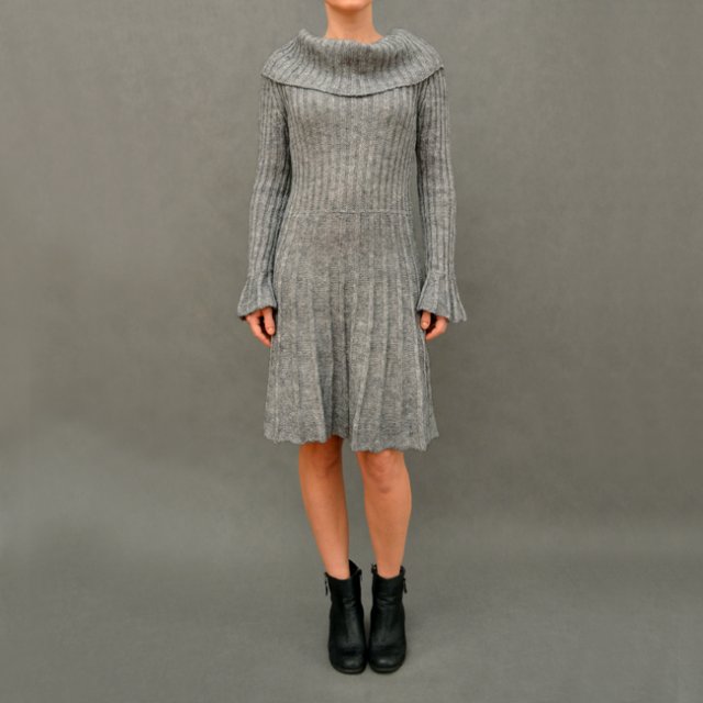 Szara, ciepła sukienka z dużym kominem-golfem. Dół lekko szerszy.