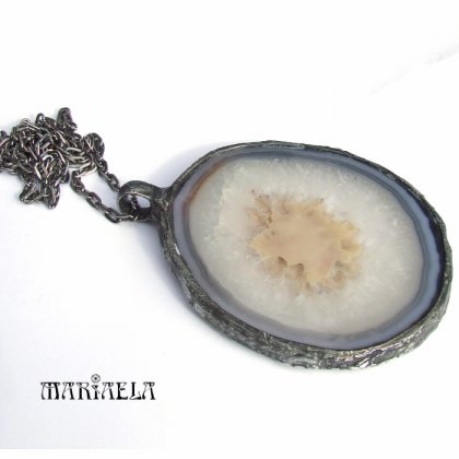 Serdecznie zapraszam do spojrzenia na wyjątkowy wisior wykonany z agatu. Średnica plastra około 10 cm. Trwałe wykończenie witrażowe. Używam wyłącznie ekologicznej, bezołowiowej cyny z domieszką srebra. Prawdziwy rarytas :-) Pojedynczy projekt! Zapraszam! MARIAELA