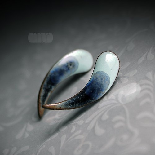 Ceramiczne podłużne kolczyki, ręcznie wykonane z delikatnej gliny kamionkowej, jednostronnie szkliwione mieszanką szarobłękitnych szkliw z efektem plamek, tył matowy czekoladowobrązowy na antyalergicznych sztyftach.długość ok 2,8cm. Polecam