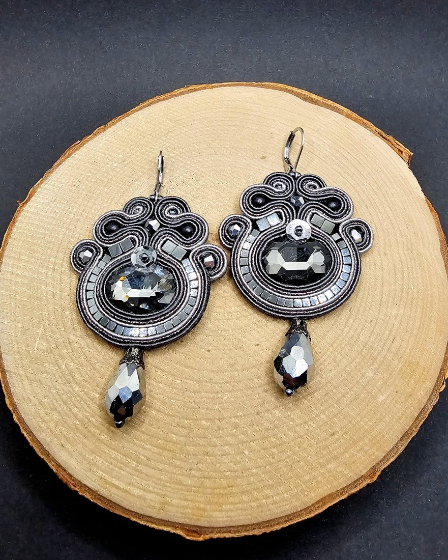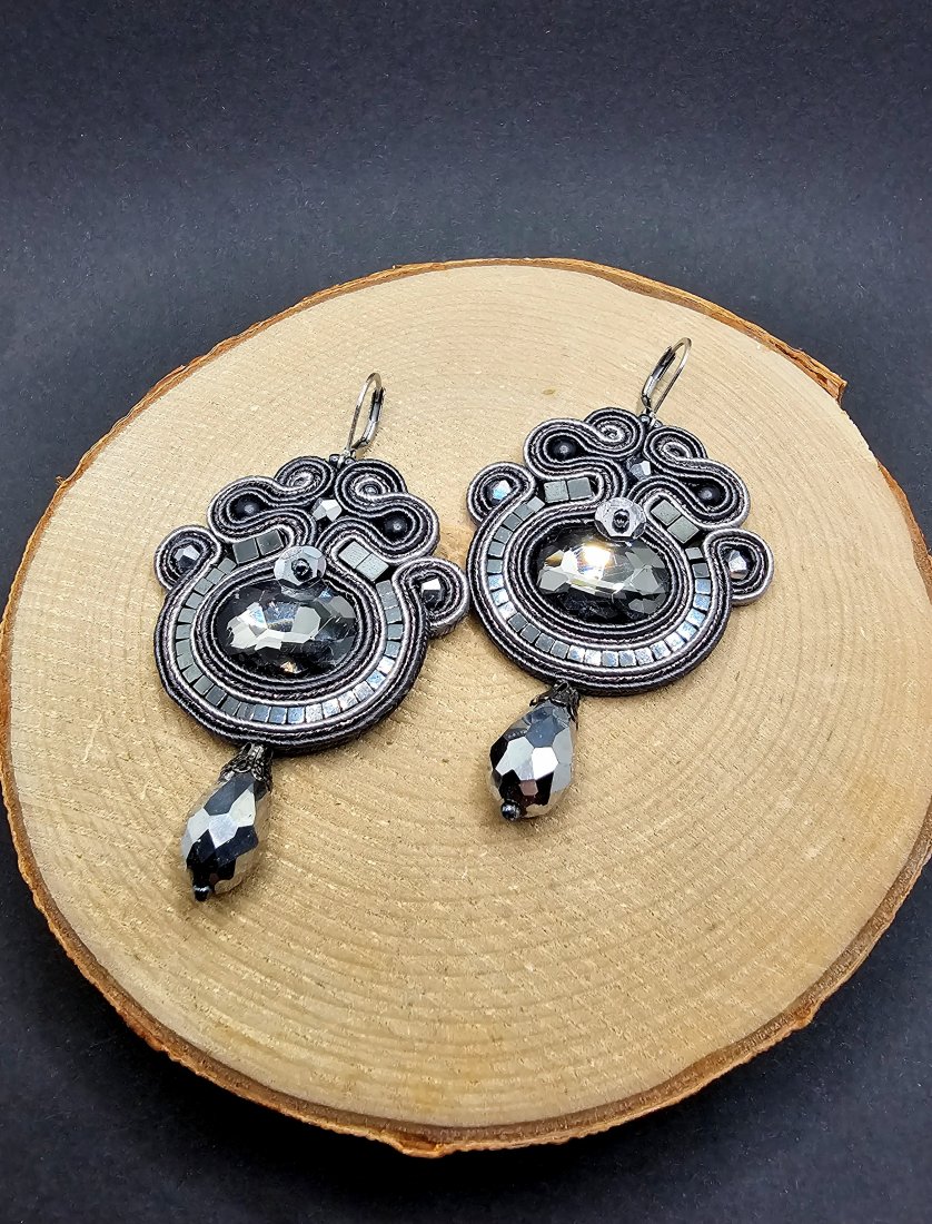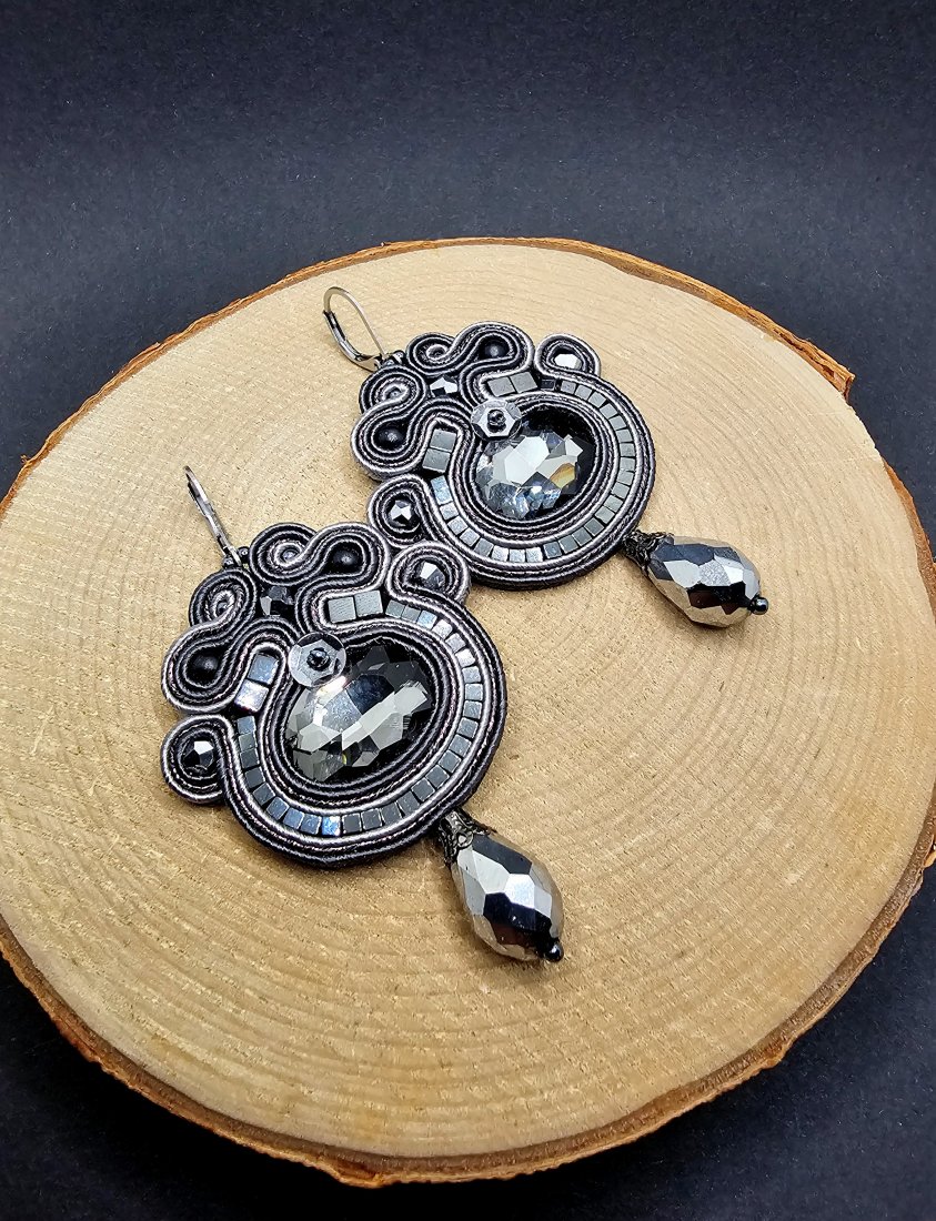 Szare fasetowane kryształki otoczone sznurkami sutasz, szklanymi czeskimi koralikami oraz kostkami hematytu o różnych wielkościach. Dół kolczyków zakończony szklanymi srebrnymi kroplami. Kolczyki zawieszone na biglach angielskich ze stali chirurgicznej.