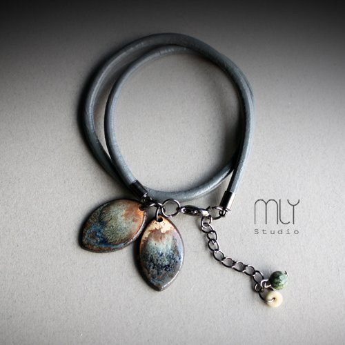 Efektowna bransoletka wykonana z rzemienia jubilerskiego w kolorze szarym elementów w kolorze ciemnego srebra i ręcznie wykonanych ceramicznych zawieszek, szkliwionych mieszanką szarobrunatnych szkliw z efektem plamek o subtelnym połysku, Obwód regulowany. Polecam. Termin realizacji zamówienia to 1-2 dni.