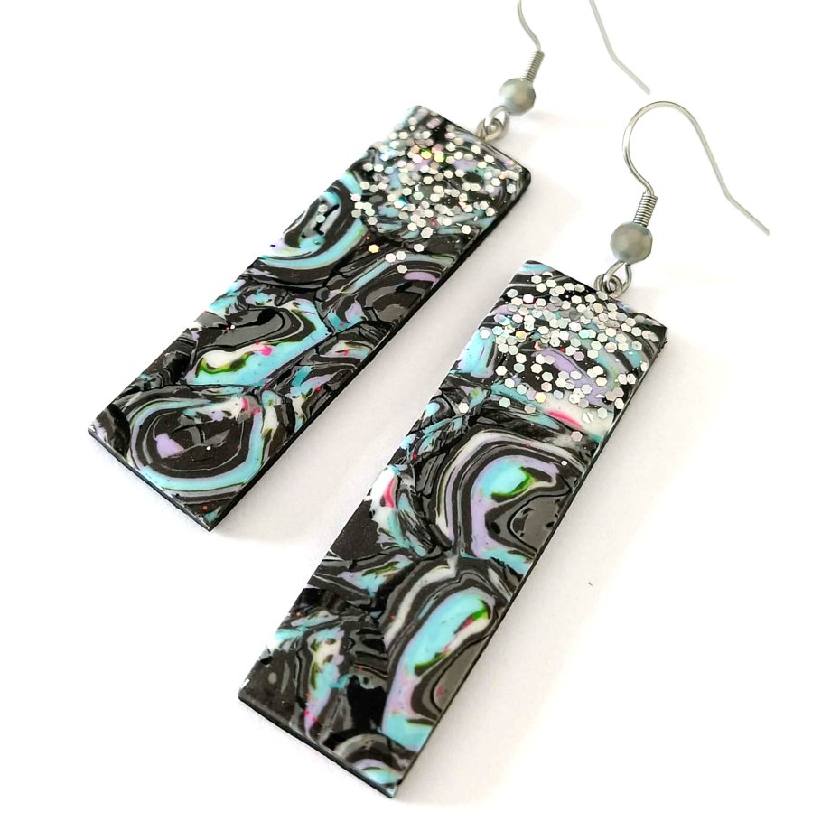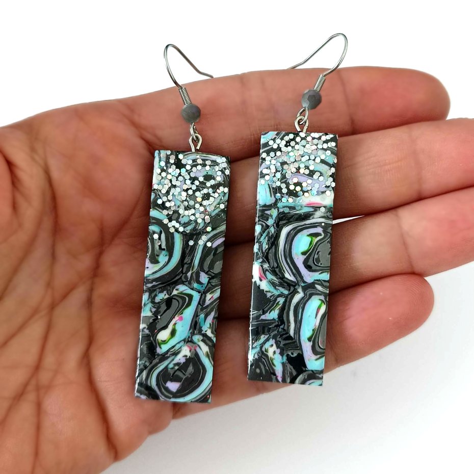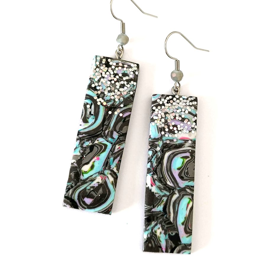 Tagi: #biżuteria artystyczna, #długie kolczyki prostokąty, #holograficzne kolczyki, #wiszące kolczyki z brokatem