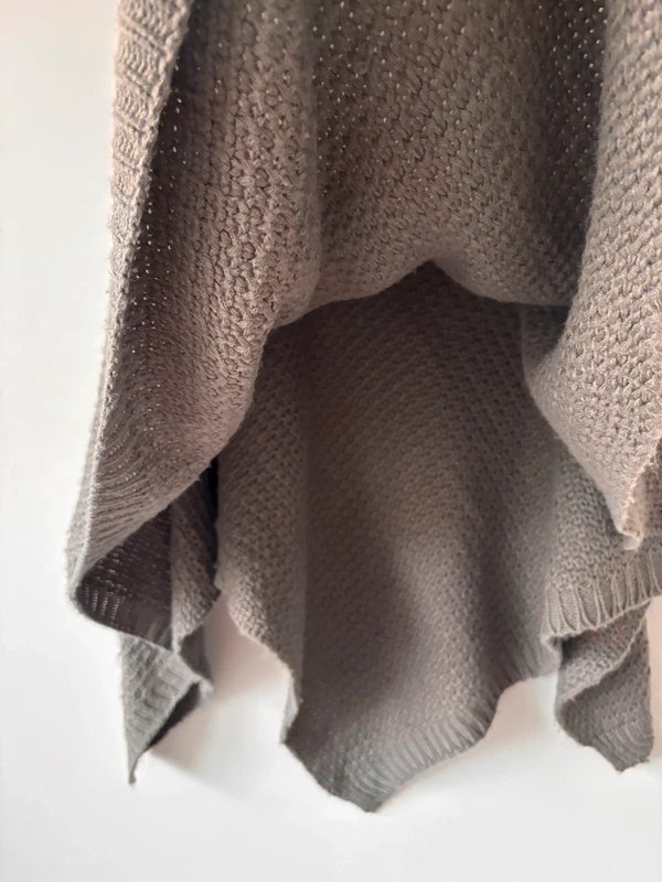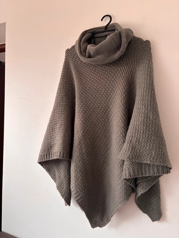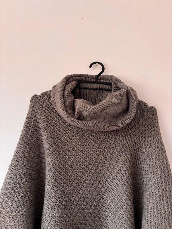 Przytulne, grube ponczo-sweter w odcieniu szarego beżu (taupe). Luźny, asymetryczny krój z szerokimi, dzwonowatymi rękawami i opadającym golfem. Wykonane z miękkiej, ciepłej dzianiny z delikatną teksturą. Idealne na chłodne dni – otula jak koc.