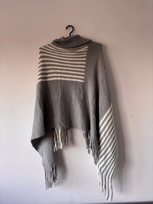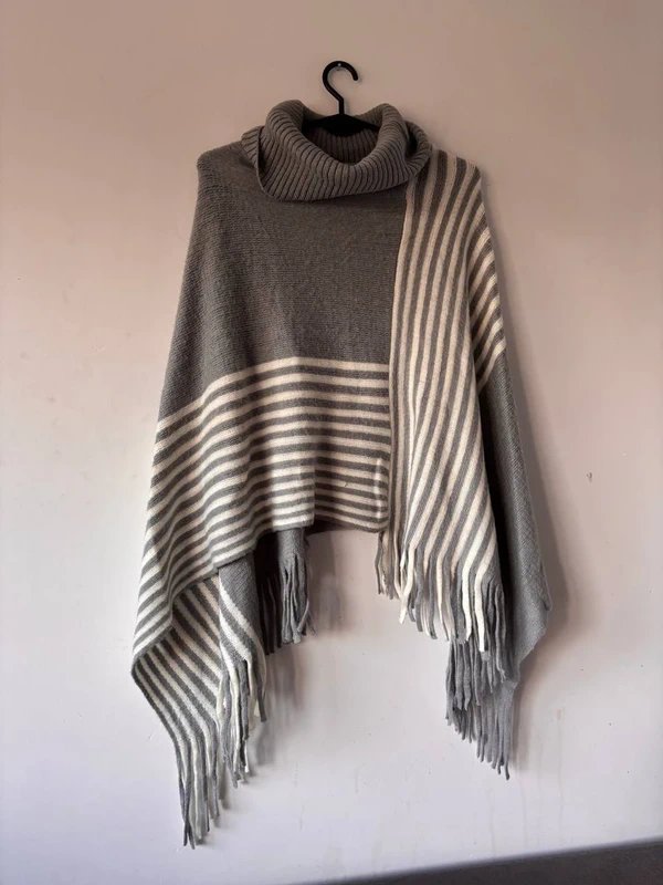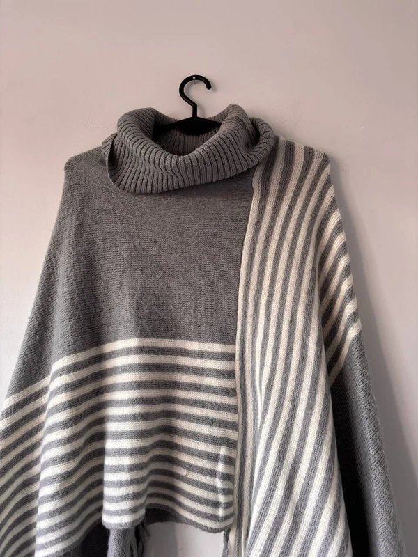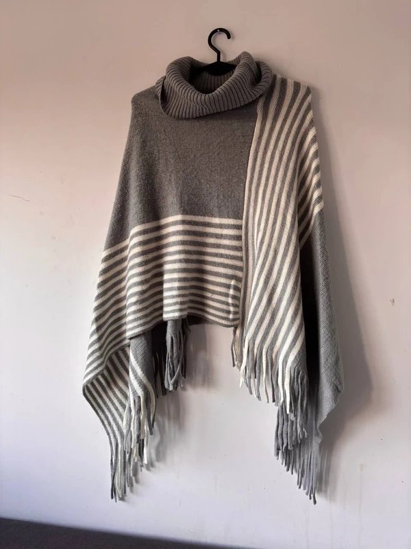 Stylowe ponczo w szaro-kremowe paski z wysokim golfem i frędzlami.