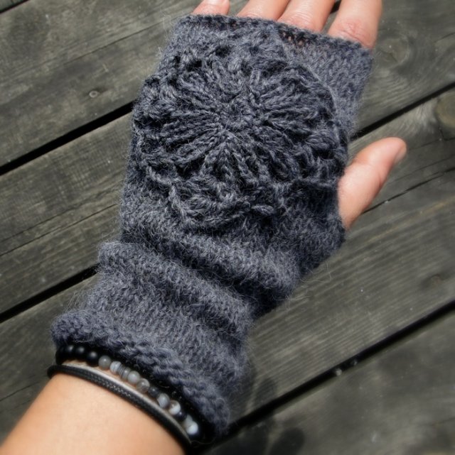 Urocze mitenki wykonane ręcznie na drutach z wysokiej jakości włóczki ( (50% ALPAKA, 50% new wool w kolorze melanżowej szarości) Ozdobione subtelną szydełkową koronką. Miękkie i miłe w dotyku. Niebanalny dodatek i ochrona przed chłodem. Długość: ok. 20 cm. Wzór autorski. Polecam serdecznie.